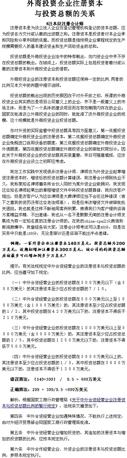 外商投资企业注册资本与投资总额的关系     (2013-5-22 13:31:16)