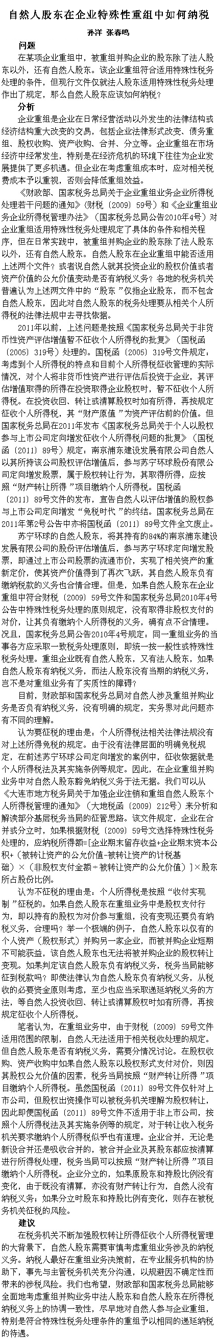 自然人股东在企业特殊性重组中该如何纳税     (2013-5-15 11:23:21)